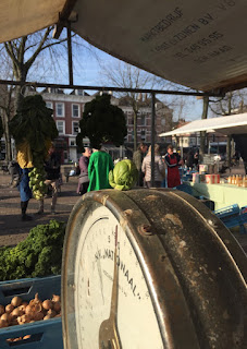 De spruitjes zijn dan wel op, een enkeling kwam er gister nog naar vragen, de boerenkool doet nog een week of 2 mee. Gert had de kisten deze keer links van de kraam neergezet. Eigenlijk had ik de boel vervolgens een beetje achteloos trapsgewijs gearrangeerd. Door een vaste klant geattendeerd - ‘de boerenkool straalt je tegemoet’ - keek ik er beter naar en zag ik de stronken shinen in de zon. Het leek wel een skipiste. Daar moest ik een foto van maken. Een passerende klant vroeg of ik er niet ook op wilde. ‘Ik sta er altijd al op’ zei ik, maar ging er toch voor staan. De wind was fris en ik liet mijn muts de hele dag op, waarover iemand zei ‘je hebt een spruitjes-muts’. Op de foto heb ik er nog een “boerenkoolmuts" overheen, het lijkt wel een kolbak. Zo’n ceremonieel militair hoofddeksel.